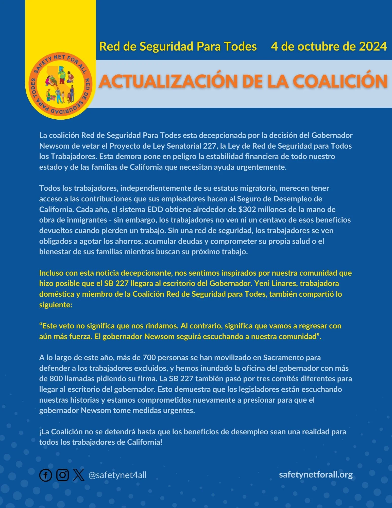 2024 SAFETY NET FOR ALL WORKERS CAMPAIGN UPDATES Stay connected! Leer en Español Coalition Update regarding Governor Newsom’s decision to veto SB227. Actualización de la Coalición sobre la Decision del Gobernador Newsom de Vetar la Propuesta de ley SB227 Coalition Update regarding new amendments to SB 227 and next steps forward. Actualización de coalición sobre nuevas enmiendas al proyecto de ley SB 227 y pasos a seguir. Governor Newsom Fails to Invest in Urgently Needed Unemployment Benefits for Undocumented Californians, Hurting Communities Affected by Disasters Read Press release Letter to Gov. Newsom Re: Historic Winter Storms and Undocumented Immigrant Communities Read More SB 227 Passes out of the Senate Labor Committee! Read Press release 2023 Campaign Launch Read More Safety Net for All Coalition Issues Statement in Response to the Governor's Proposed Budget Read Full Statement Coalition Statement on Governor Newsom’s Veto of AB 2847 Read Full Statement